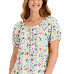 Charming florals and playful puff sleeves adorn this petite top from Style & Co. Add to your casual closet for endless styling options.