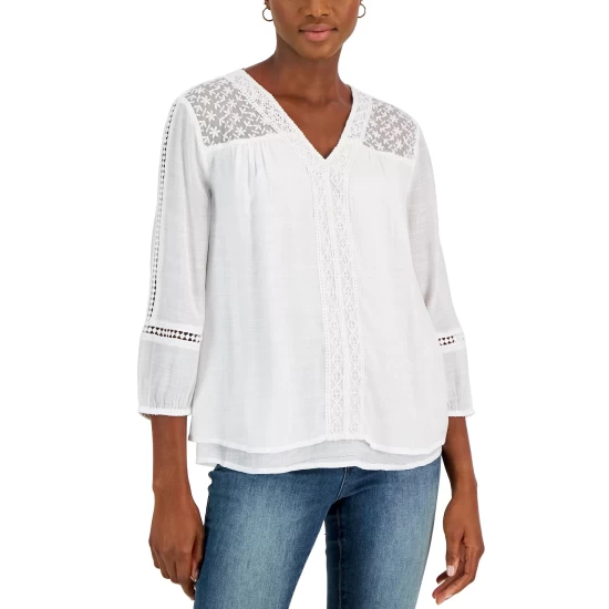 Your new favorite casual top, this Style & Co top features a V-neck design and beautiful embroidered, lace-like trim and accents.